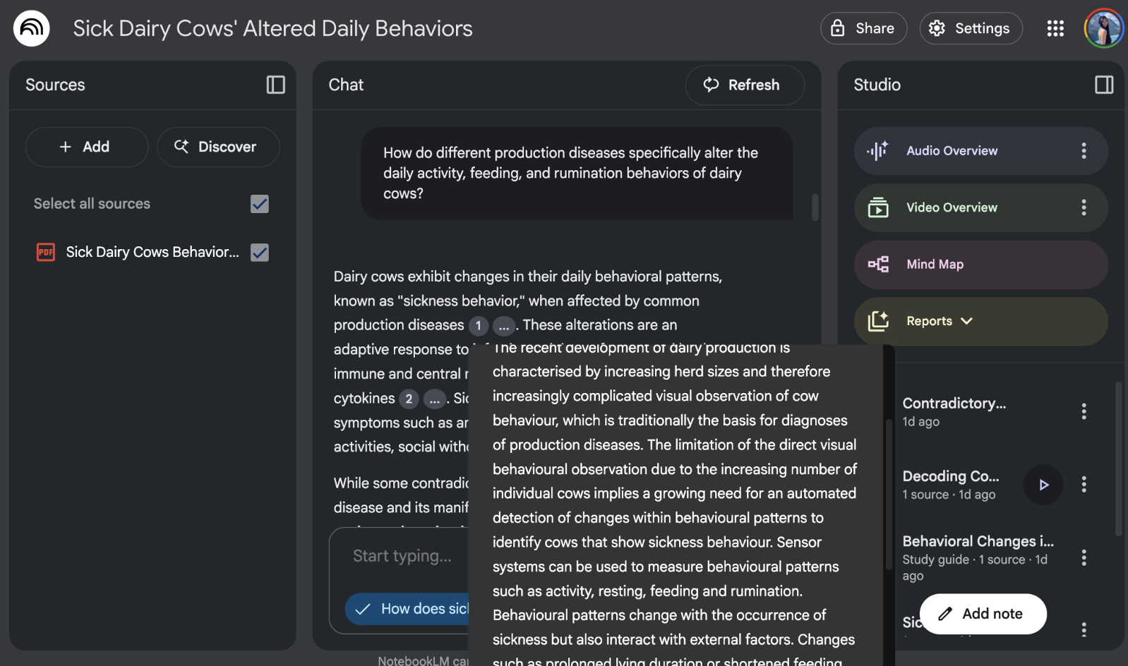 Below is an example usecase of notebookLM: a scientific review paper about how dairy cows change their behaviours when they are sick