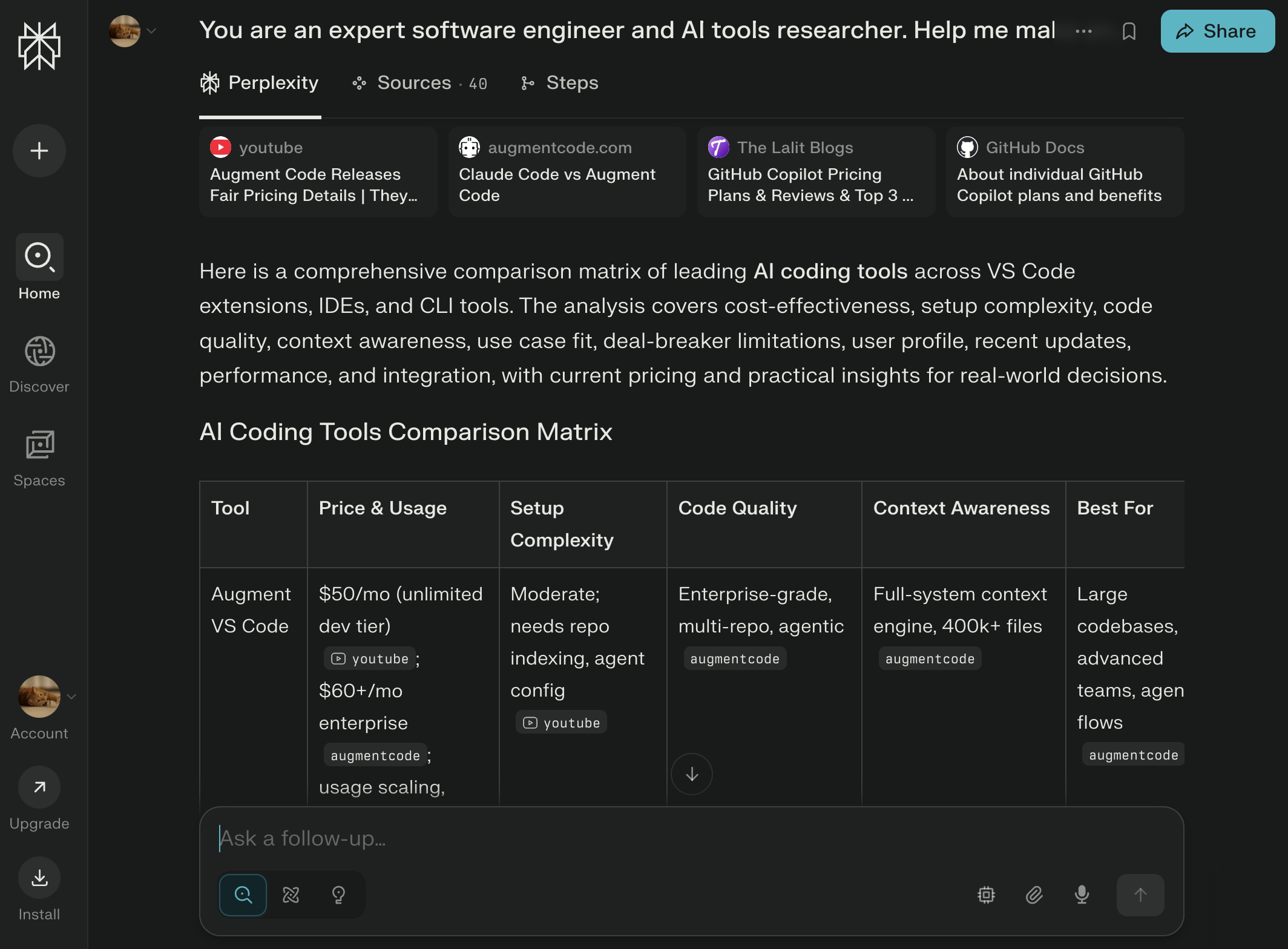 Below is an example usecase of perplexity: https://www.perplexity.ai/search/you-are-an-expert-software-eng-RPxbHEJKTzO064CJ86yZOA