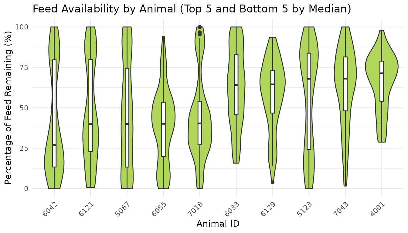 # Violin plot of feed availability by animal (top 5 and bottom 5 by median pct_feed_remaining)